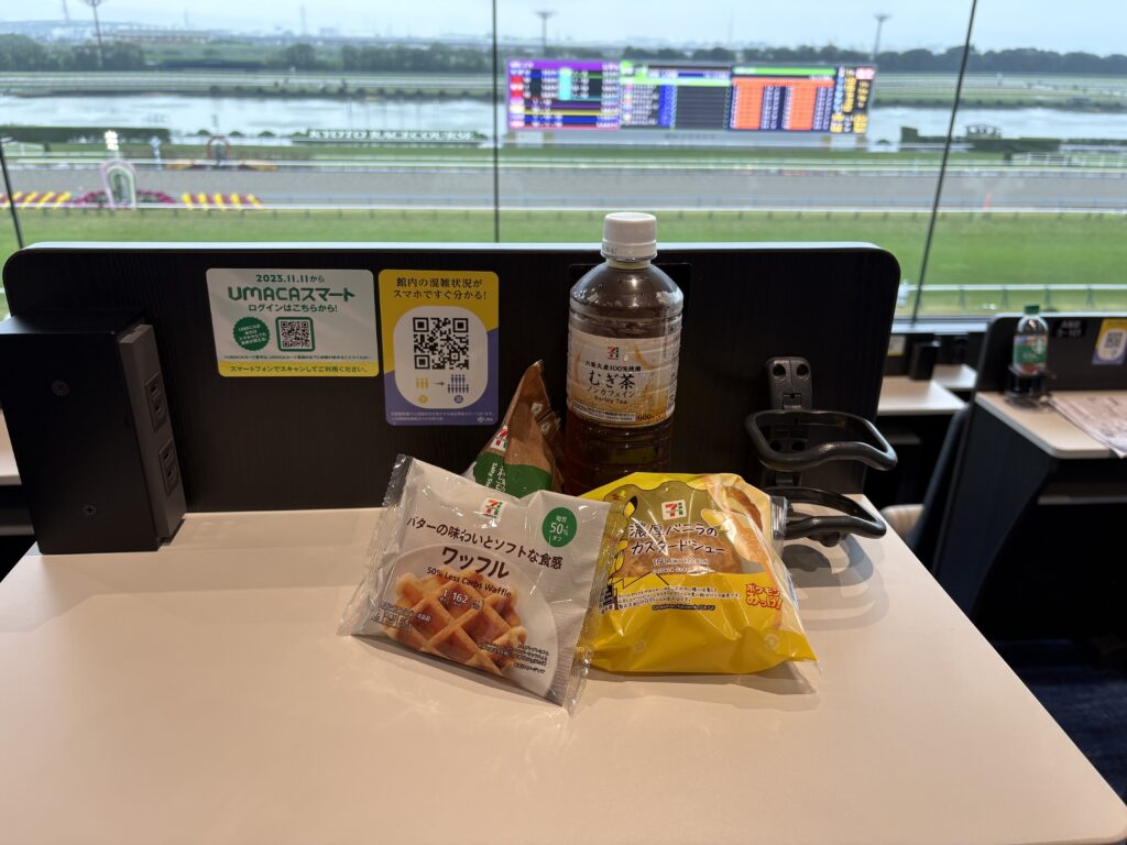 ランチを安価に抑えたいならコンビニ弁当が一番お得。京都競馬場内のコンビニはここ1店舗のみで、いつも込んでいる。飲み物も売っていて競馬場内の自販機より安い。※場所:ステーションサイド2F