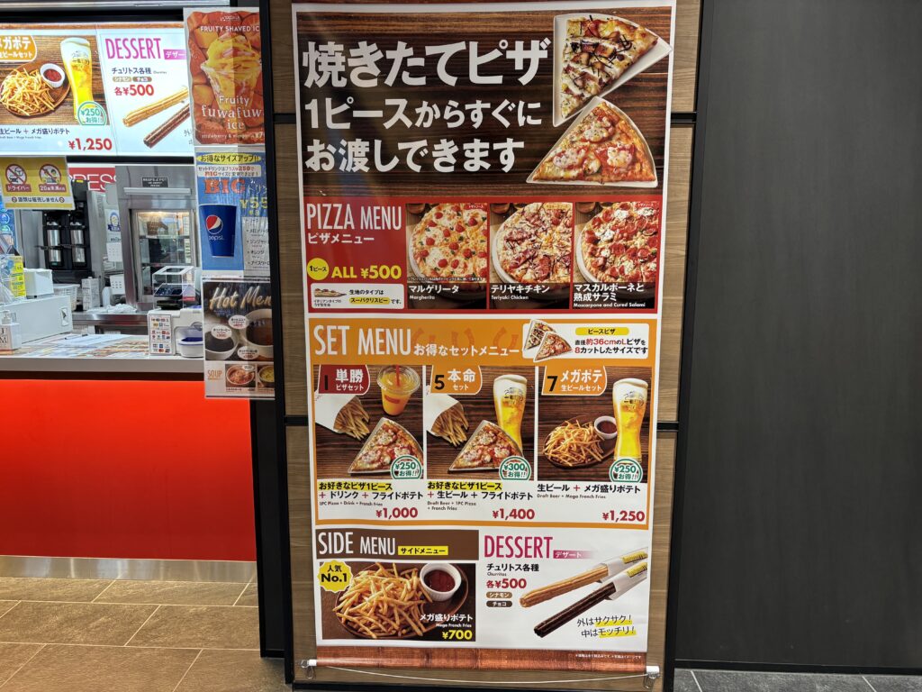 大手ピザ屋のチェーン店。メニューは「単勝ピザセット」や「馬連ピザセット」など競馬にちなんだネーミングの商品が並ぶ。ピザは直径約36cmのLピザを8カットしたサイズ。1番人気は「メガ盛りポテト」らしい。※場所:1Fフードコート
