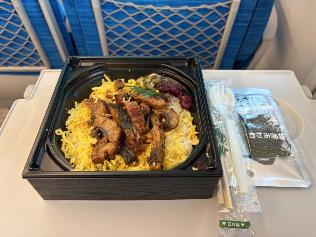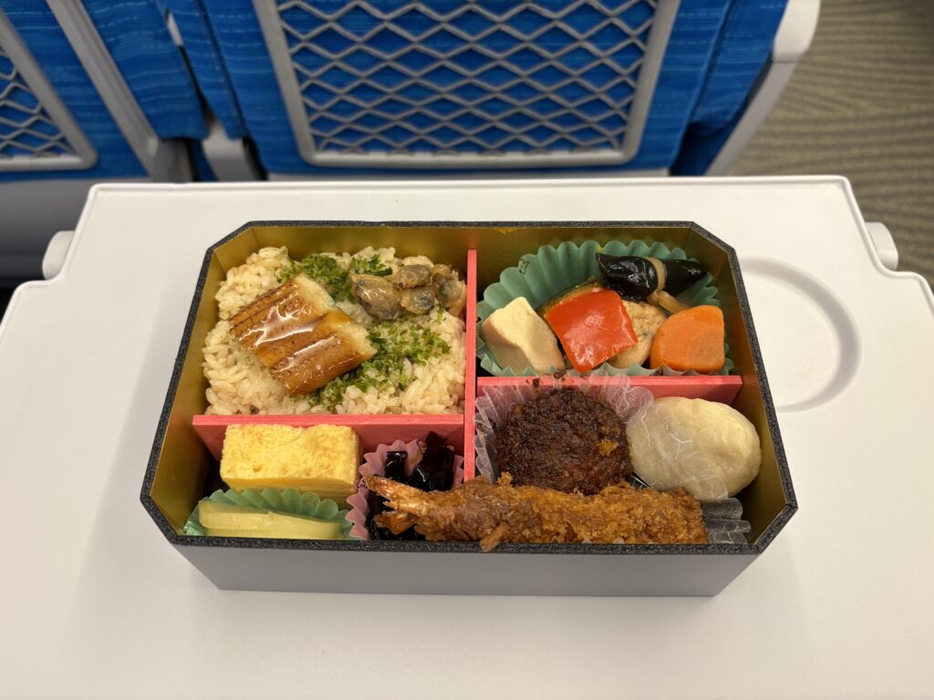 名古屋の名物グルメがたくさん詰まった駅弁。みそカツ、エビフライ、鶏からあげ、ひつまぶし風ごはん、きいはん、名古屋コーチン入り鶏めしなど、名古屋グルメをたっぷり味わえる。ひつまぶしのウナギは小さいけれど柔らかくて歯ごたえあり。みそカツとエビフライは同じたれで、味はかなり濃い。